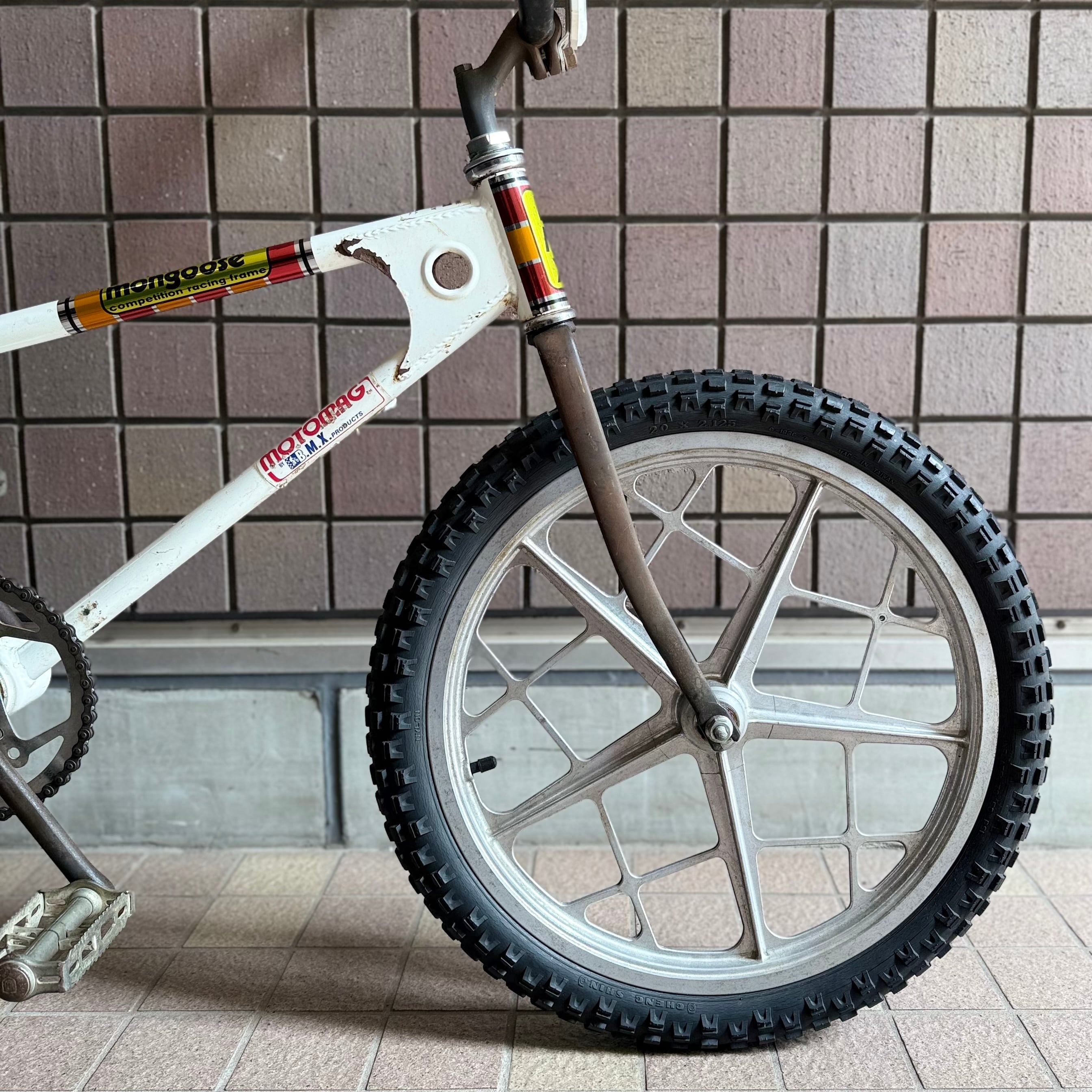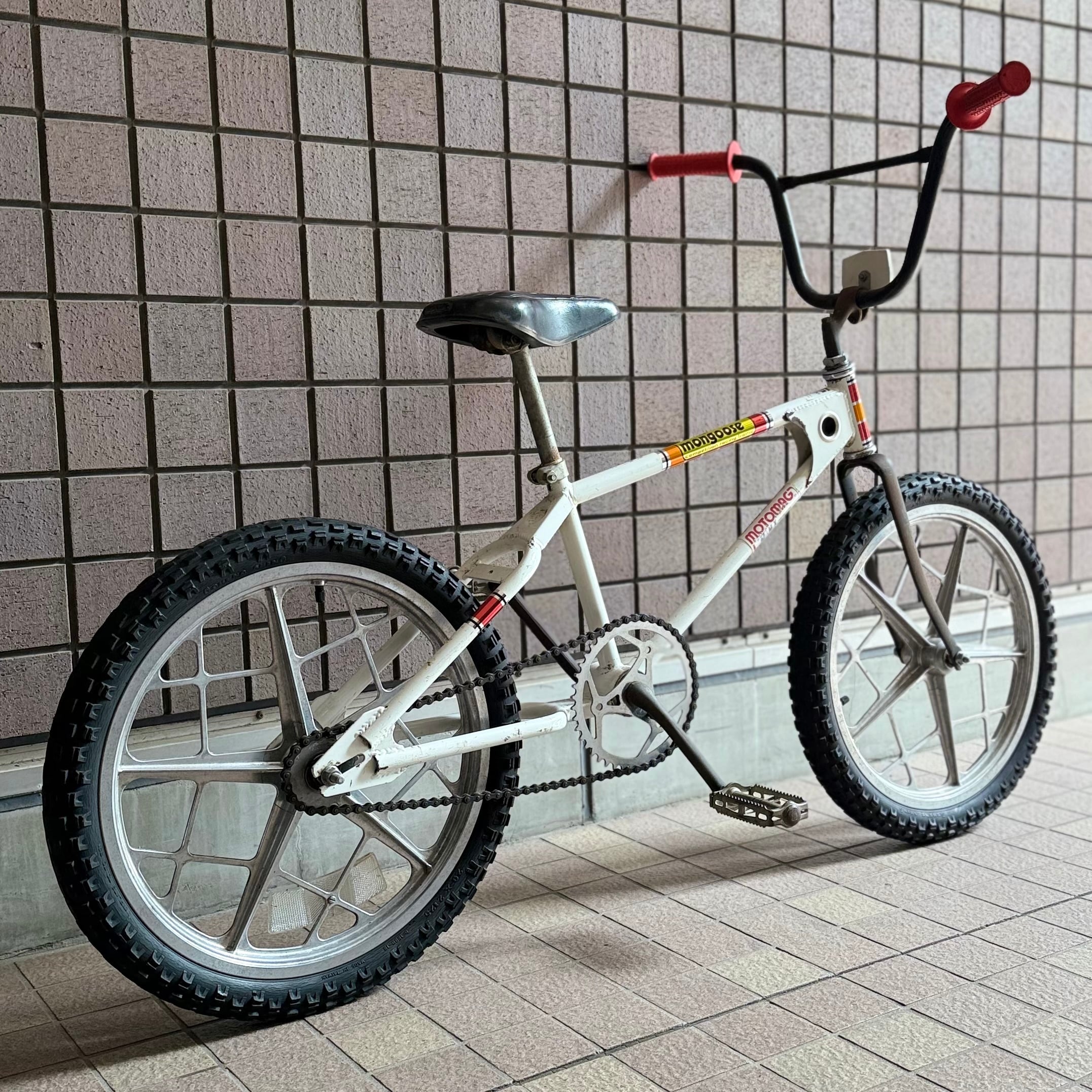 オリジナルペイントのサバイバーMONGOOSEです。’78のアシュタブラMXフォークにフレームにコースタータブが着いたモデルになります。ステッカーの一部、グリップ、チューブは、レプリカや新品をつかいましたが他は当時のパーツのままです。。